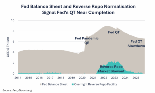 The Fed has hit a clear liquidity inflection after two years of balance sheet contraction. Since April 2022, assets are down about US$2.4T to ~US$6.6T and the Overnight Reverse Repo Facility has fallen from US$2.4T to ~US$10B, signalling scarce excess cash. The Fed will end QT on 1 December 2025, reinvesting Treasuries and redirecting agency mortgage-backed securities into Treasuries, alongside the October 25bp cut to 3.75–4.00%. That puts US$40–50B/month of price-insensitive demand back into the market, anchoring the long end and reducing upside yield risk as reserves stabilise.